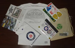 SOCJロゴ付の袋に詰められた、プログラム・ステッカー・記念プレート・Tシャツ等です。
