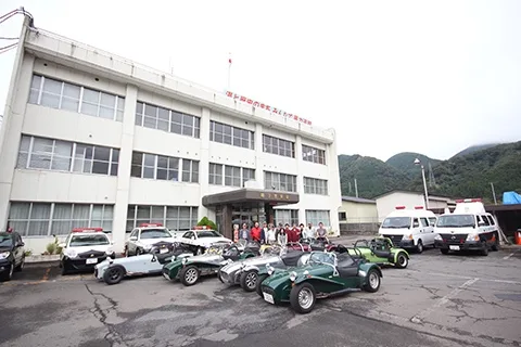 鳴子警察署の前でセブンを並べ、記念撮影をする。しかも警察官に撮って頂く。