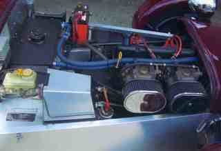 見慣れた(ノーマル)エンジンルームですが、バッテリーやホース類はしっかりと変えてあります。